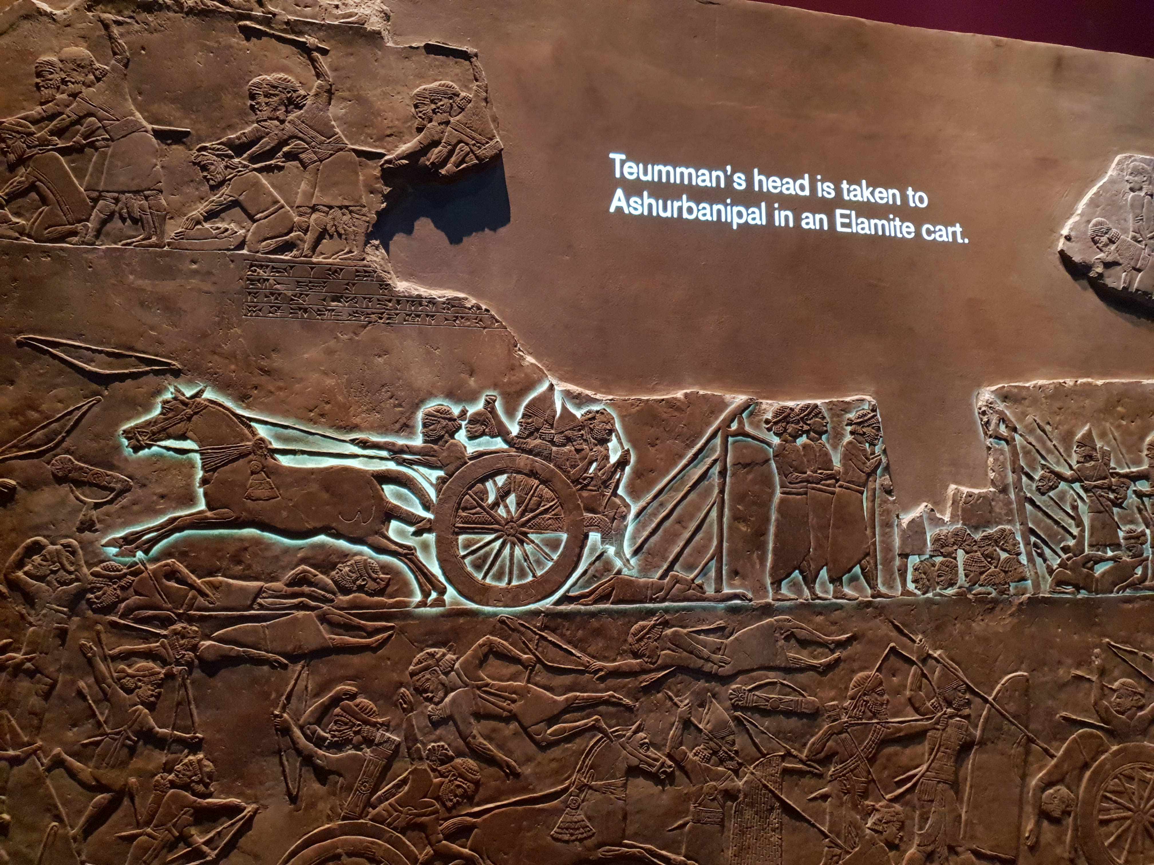With a bit of clever 21st century projection onto the reliefs by the museum curators, and some appropriate sound effects, the reliefs were transformed from being just a wall of inscribed plaster and stone into a 2,500 year old comic strip. As the story unfolded, the crowd of people in the exhibition, including me, were transfixed by the experience. We all just love a good story.