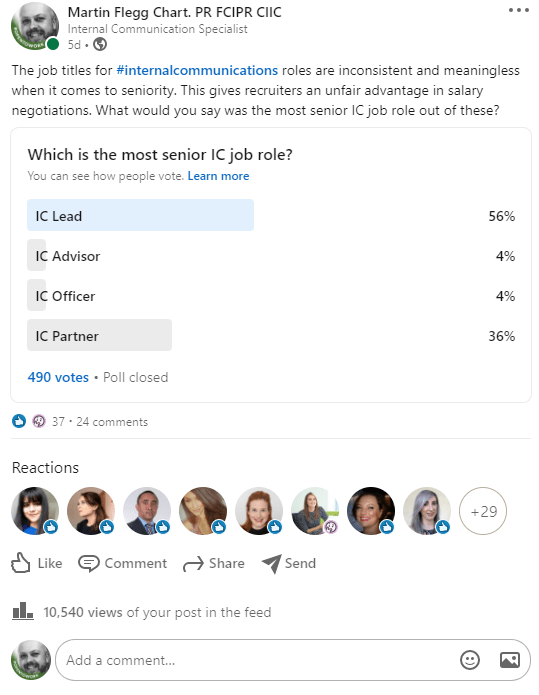 There was some clear consistency between the results of both polls with the majority voting Internal Communications Lead as the most senior and Internal Communications Business Partner as the runner up. Thanks to everyone who voted and to those who also commented. You are the inspiration for much of what follows.